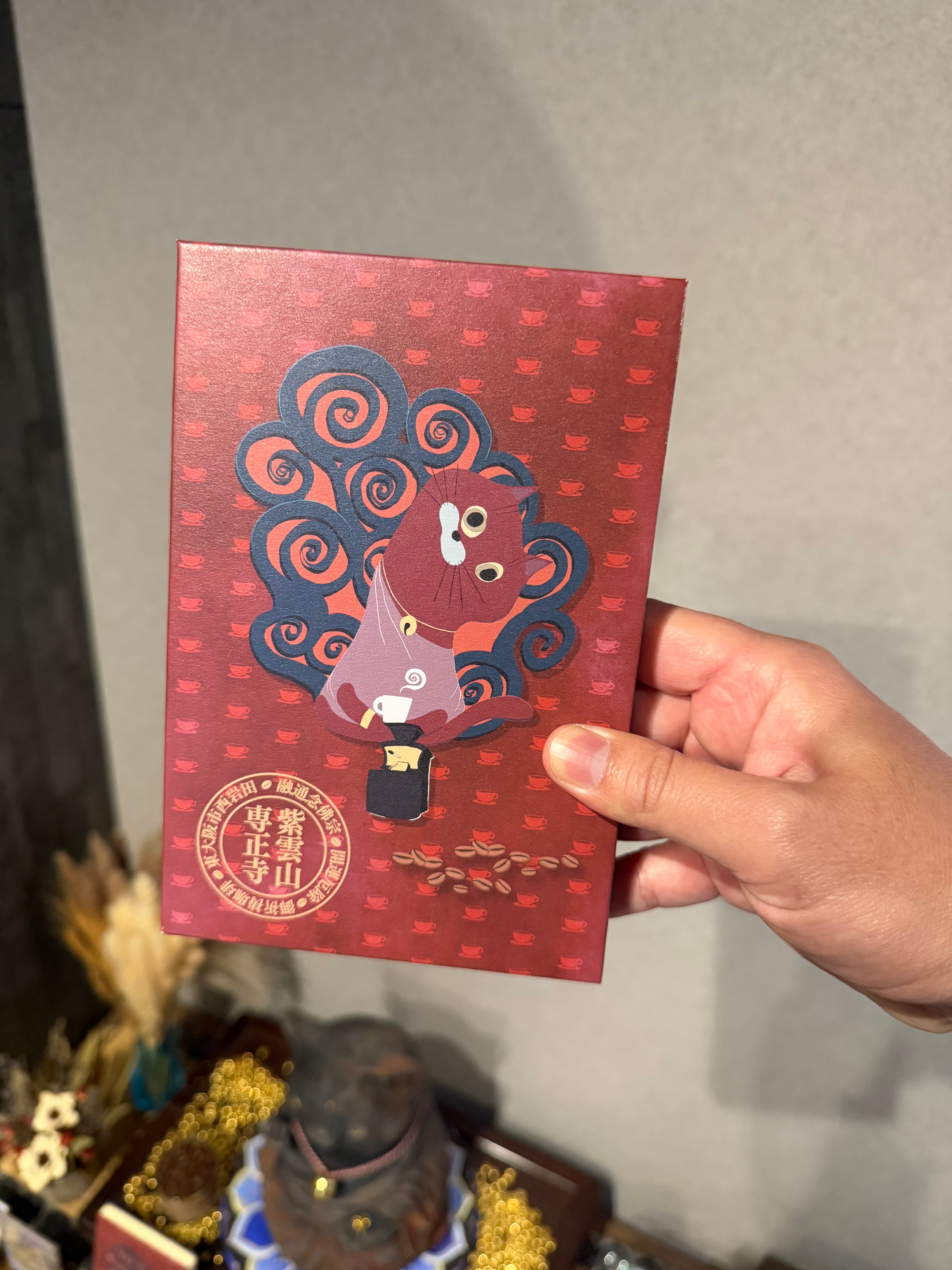 NIRVANA Coffee専正寺から、焙煎機の炎から生まれた不動明王のアシャラ様が、煩悩を断ち切るための剣や縄ではなく、厄除招福のご祈祷祈願されたコーヒーで煩悩を断ち切るを意味した阿吽になっているイラストの御朱印帳をどうぞ手にしてください。