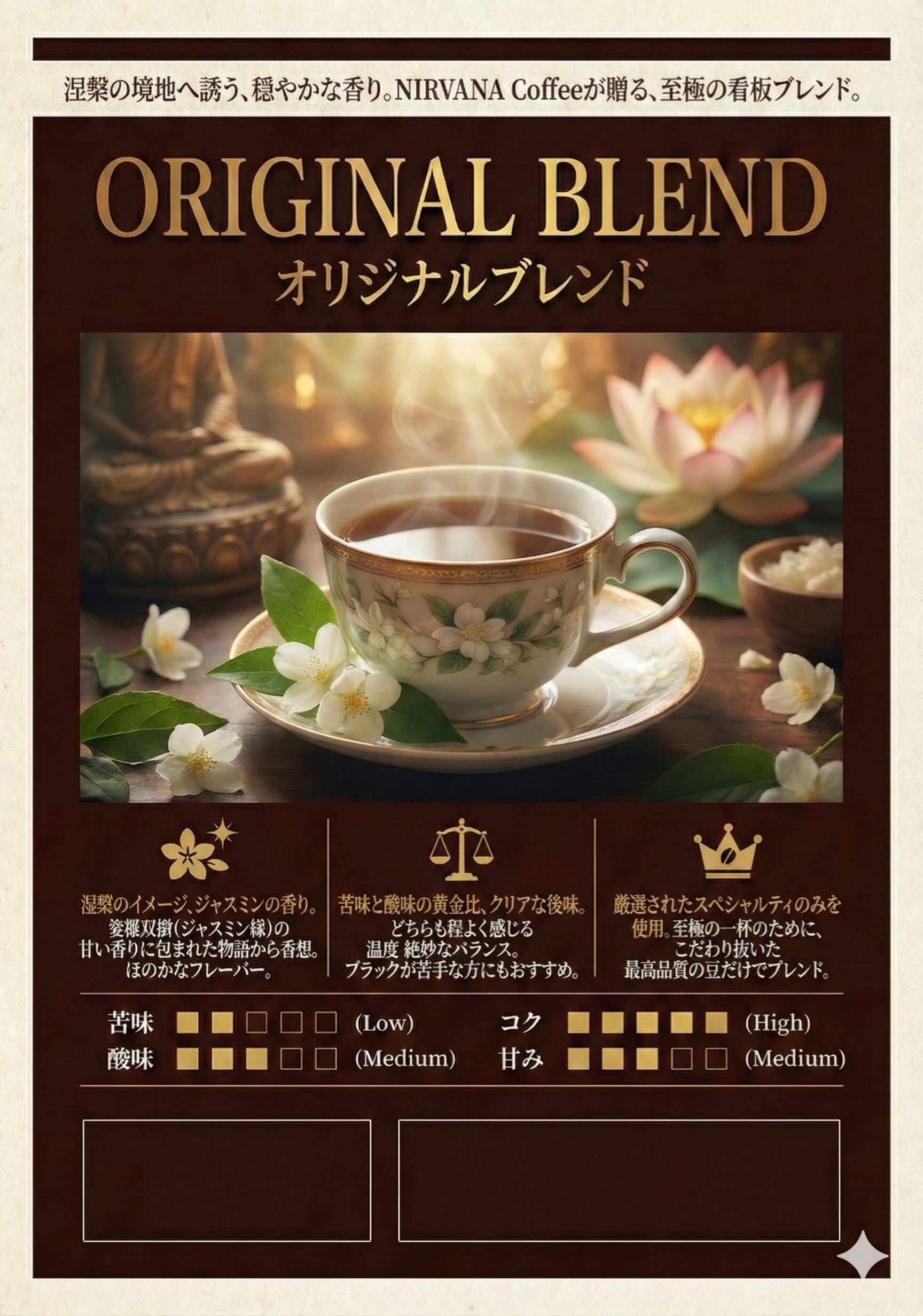 涅槃図にあるお釈迦さまが入滅(涅槃)されたときに娑羅双樹の花が咲き、そのジャスミンのような甘い香りに包まれて穏やかに身体的な苦から脱して涅槃に入られたお話から、苦味も酸味も程よく感じ、香り、フレーバーにほのかにジャスミンを感じていただけるように涅槃の話からイメージしてスペシャルティの豆のみでブレンドしたクリアな至極の一杯をどうぞ。(苦すぎるのが苦手、酸味が苦手な方にもおすすめです)