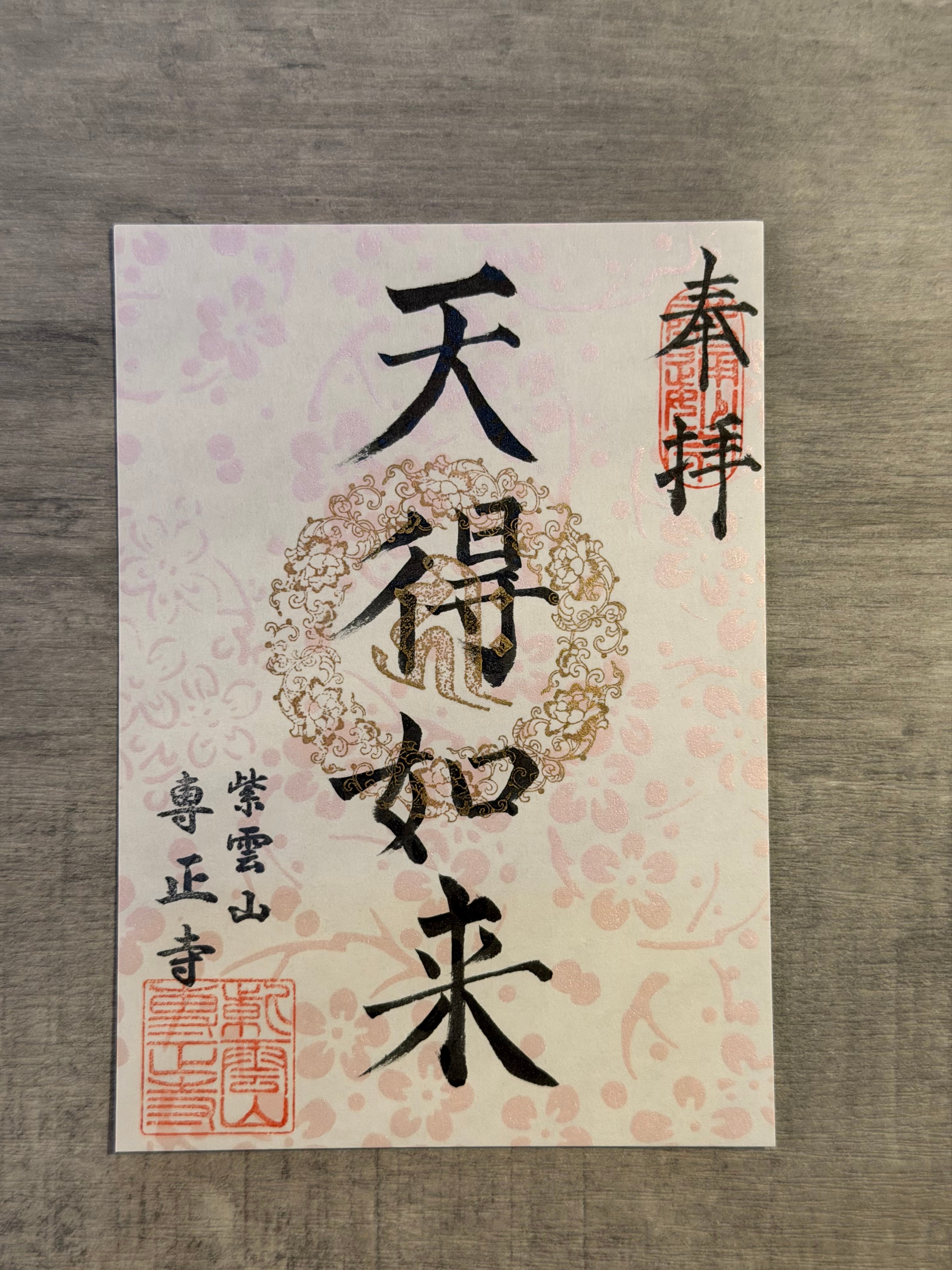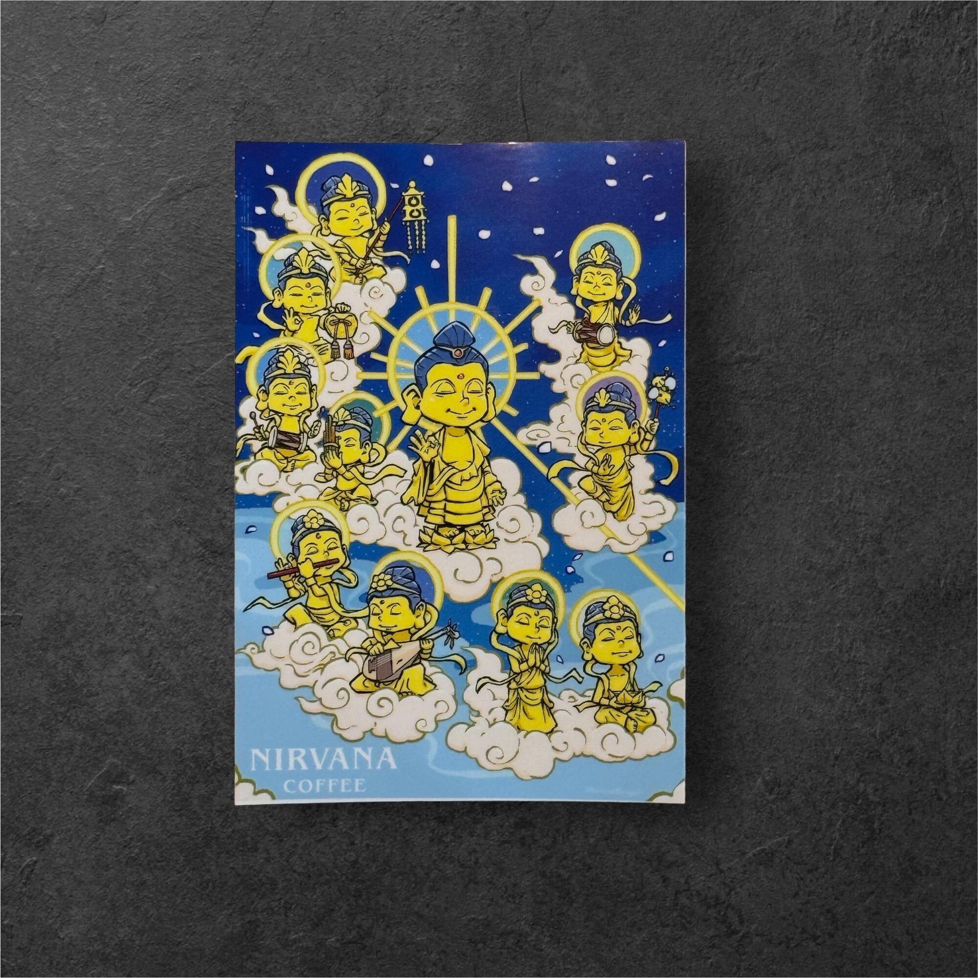 専正寺とNIRVANACoffeeコラボの御朱印、ご本尊の十一尊天得如来さまの掛け軸の絵がイラスト(アカハナドラゴン先生)になってステッカーとしてセット奉納となります。