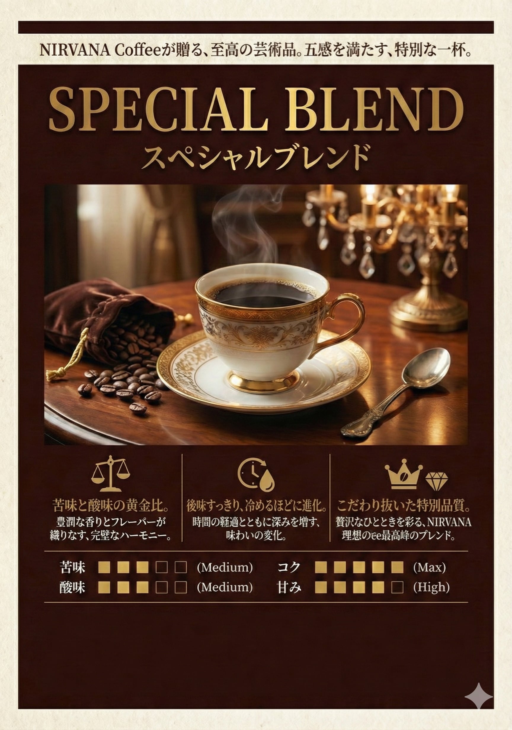 ほのかな甘い香り、飲んだ後に残る余韻の数々、しっかりコクもあり、苦味と酸味のバランスがとても良く、飲み後はスッキリしていて、冷めていく過程で味わいが増していくようにブレンド。