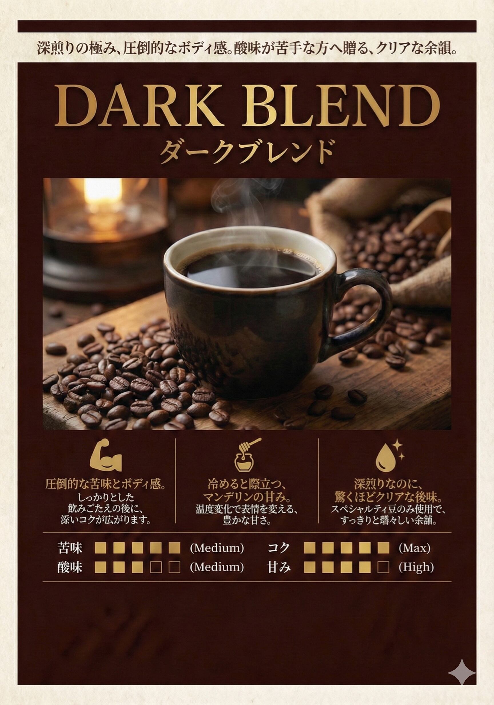 しっかりとしたボディ感に苦味の後にコクが、冷めてくるとマンデリンの甘さが際立ち、深煎りなのに飲んだ後はすっきりクリアで水々しい後味をスペシャルティのみでブレンドしました。